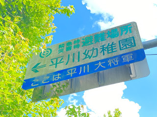 気象警報で「平川大将軍」という土地をみつけて、これは訪れねばと思っていた。この辺り一帯を平川というらしく、平川野原、平川指月など同様の看板がある。しかし、この辺りは住宅街で看板らしい看板はこれしかなく、暑い中をひたすら歩きまわって汗まみれで「大将軍」を見つける。